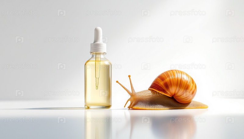 Два флакона с сывороткой с муцином улитки и одна большая улитка на зеркальной поверхности