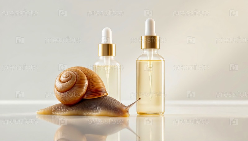 Два флакона с сывороткой с муцином улитки и одна большая улитка на зеркальной поверхности