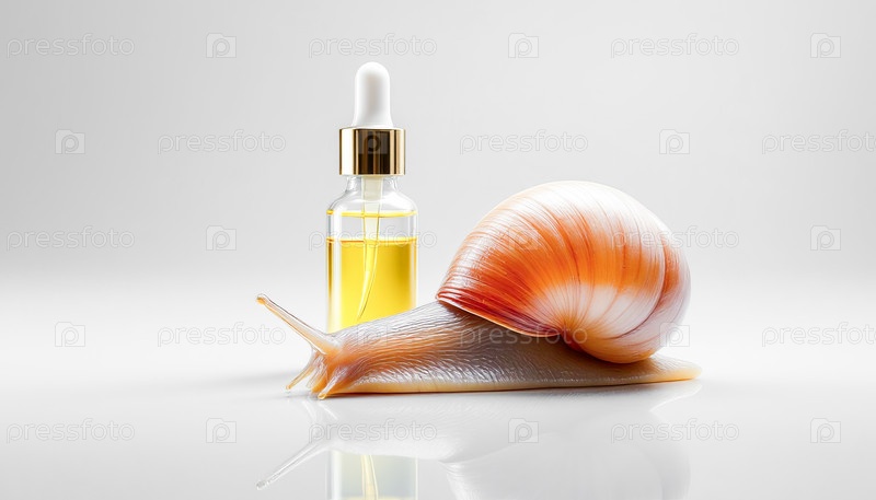Два флакона с сывороткой с муцином улитки и одна большая улитка на зеркальной поверхности