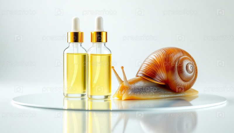 Два флакона с сывороткой с муцином улитки и одна большая улитка на зеркальной поверхности