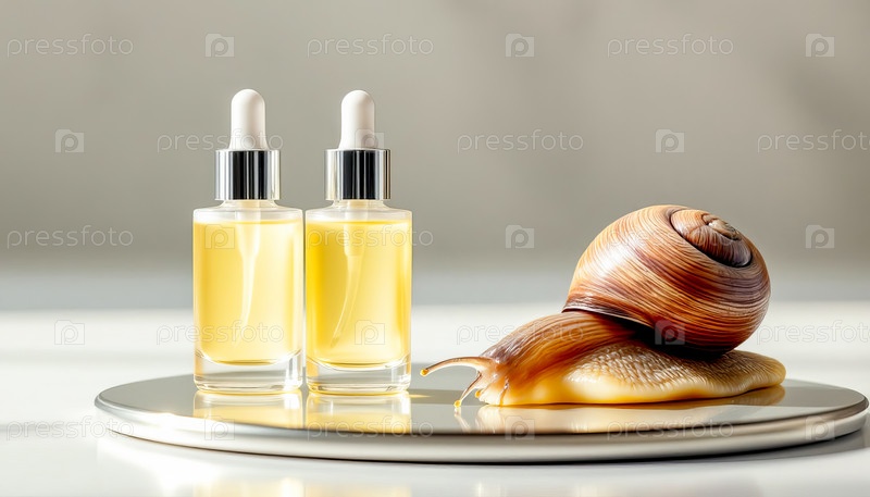 Два флакона с сывороткой с муцином улитки и одна большая улитка на зеркальной поверхности