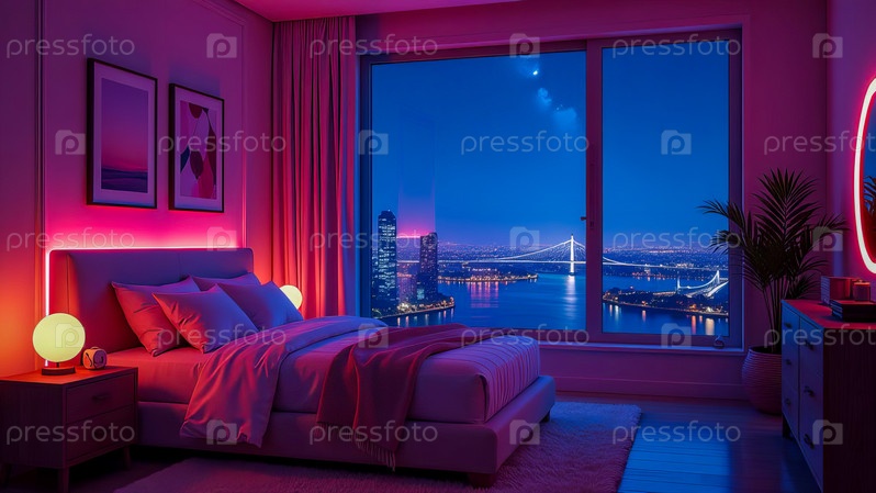 Интерьер спальни с большим окном и ночным городским пейзажем с неоновыми огнями