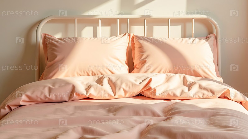 Шелковое постельное белье персикового цвета на белой кровати в светлой комнате. Сгенерировано с помощью ИИ