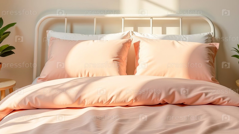 Шелковое постельное белье персикового цвета на белой кровати в светлой комнате. Сгенерировано с помощью ИИ