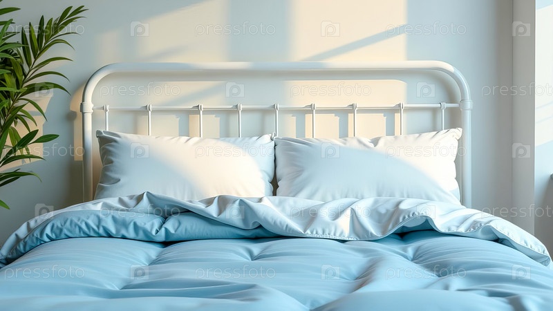 Шелковое постельное белье пастельно-голубого цвета на белой кровати в светлой комнате. Создано с помощью ИИ