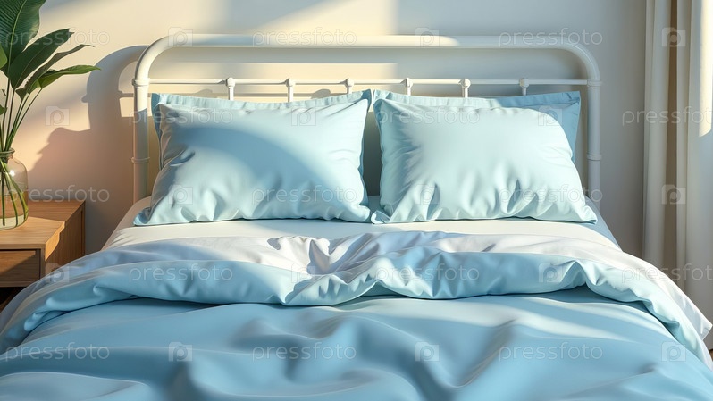 Шелковое постельное белье пастельно-голубого цвета на белой кровати в светлой комнате. Создано с помощью ИИ