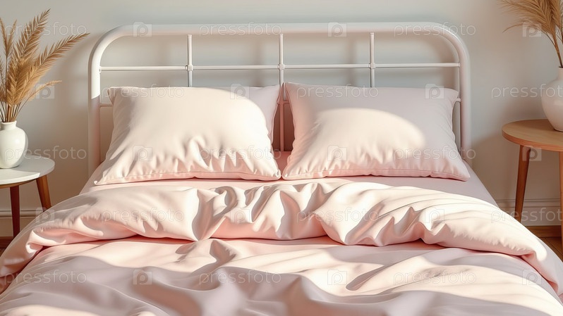 Пастельно-розовое шелковое постельное белье на белой кровати в светлой комнате. Сгенерировано с помощью ИИ