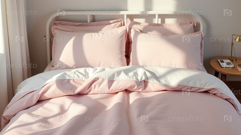 Пастельно-розовое шелковое постельное белье на белой кровати в светлой комнате. Сгенерировано с помощью ИИ
