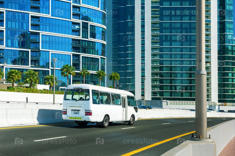 Белый автобус на дороге в городе Дубай, Объединенные Арабские Эмираты. Туристический автобус, автобус до пляжа