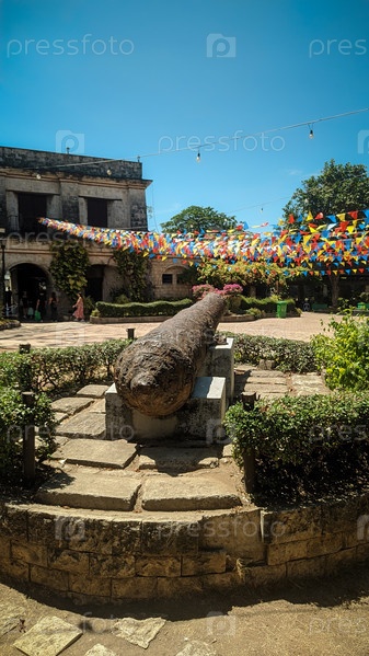 Пушка в форте Сан-Педро в Себу, Филиппины, представляет собой треугольную крепость с пышной зеленью, историческими пушками и видом на оживленный город