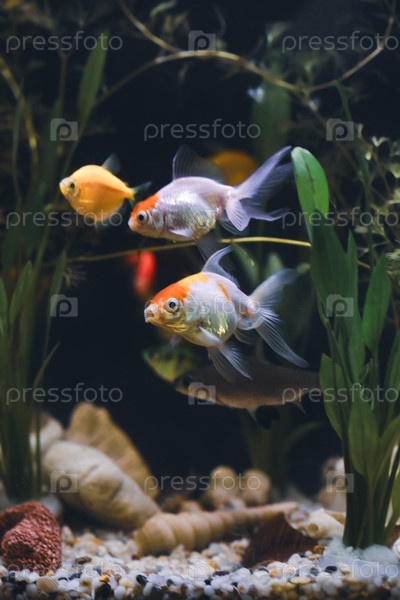 Пара золотых рыбок оранда красная шапочка. Яркий аквариум, наполненный разноцветными рыбками и пышными растениями