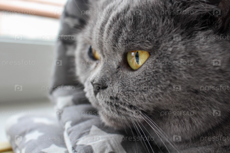 Крупным планом — голубой британский кот смотрит в окно, лежа на одеяле