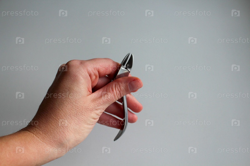 Маникюрные щипчики в женской руке на белом фоне