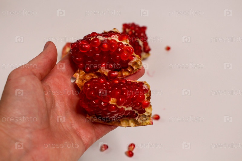 Сладкий красный гранат, изолированный на белом фоне в руке