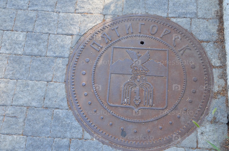 Крышка канализационного люка с надписью Пятигорск на тротуаре, выложенным тротуарной плиткой