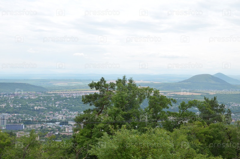 Вид на панораму города Пятигорск и горы Юца и Джуца на заднем фоне с вершины горы Машук