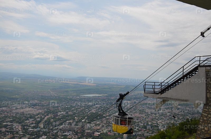 Верхняя станция пассажирской маятниковой безопорной канатной дороги города Пятигорска на горе Машук, желтый вагончик фуникулера, панорама Пятигорска у подножия горы Машук в летний день