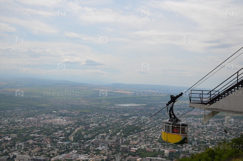Верхняя станция пассажирской маятниковой безопорной канатной дороги города Пятигорска на горе Машук, желтый вагончик фуникулера, панорама Пятигорска у подножия горы Машук в летний день