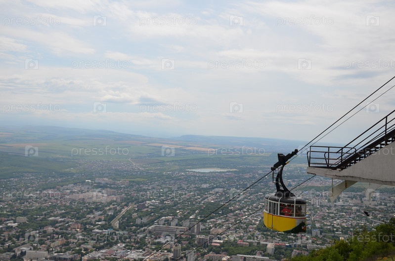 Верхняя станция пассажирской маятниковой безопорной канатной дороги города Пятигорска на горе Машук, желтый вагончик фуникулера, панорама Пятигорска у подножия горы Машук в летний день