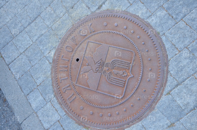 Крышка канализационного люка с надписью Пятигорск на тротуаре, выложенным тротуарной плиткой