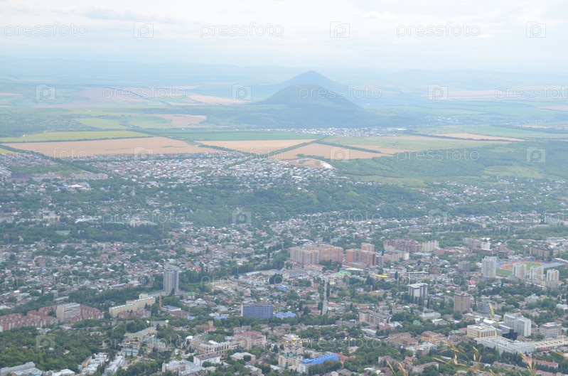 Вид на панораму города Пятигорск и горы Юца и Джуца на заднем фоне с вершины горы Машук