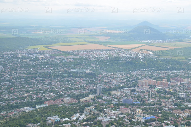 Вид на панораму города Пятигорск и горы Юца и Джуца на заднем фоне с вершины горы Машук