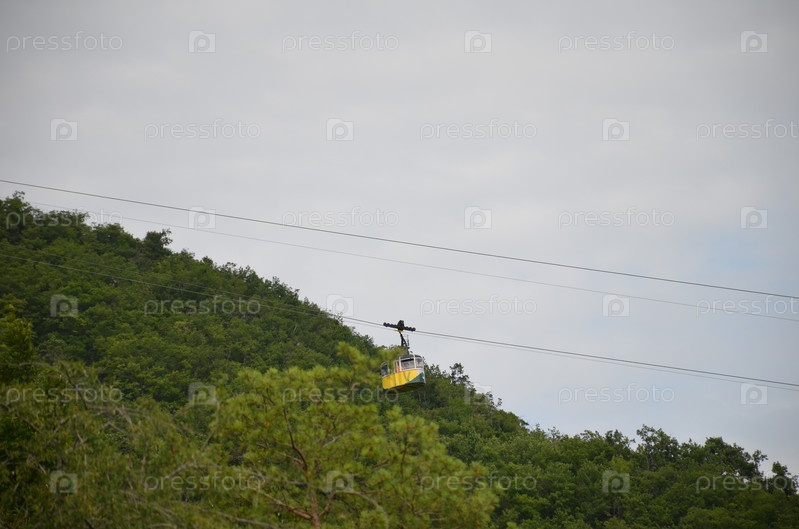 Желтый вагончик фуникулера пассажирской маятниковой безопорной канатной дороги города Пятигорска на горе Машук