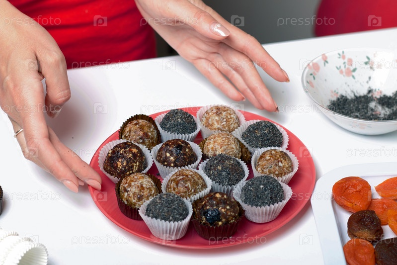 Женщина держит в руках тарелку с конфетами из сухофруктов. Из чернослива, фиников и кокоса. С посыпкой из черного кунжута