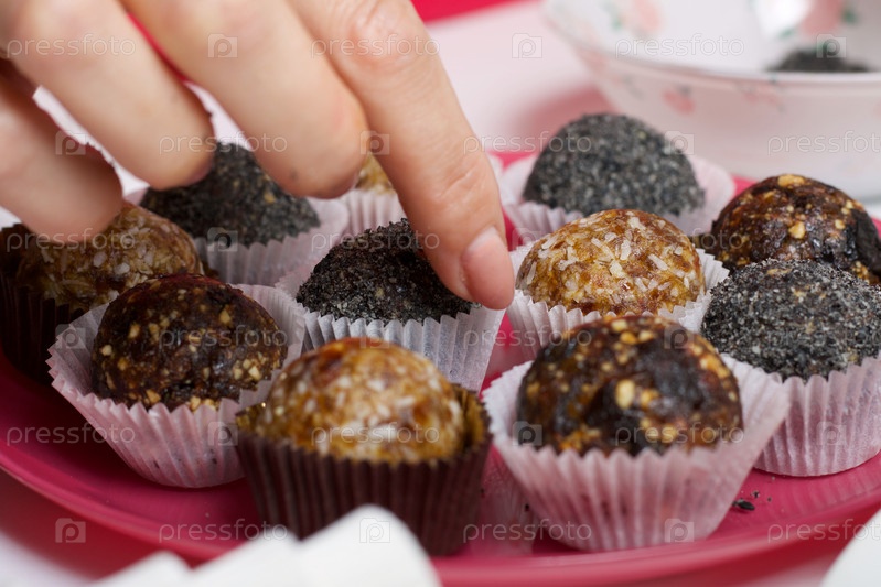 Женщина кладет на тарелку сухофруктовые конфеты. Шарики из чернослива, фиников и кокоса. Посыпанные черным кунжутом