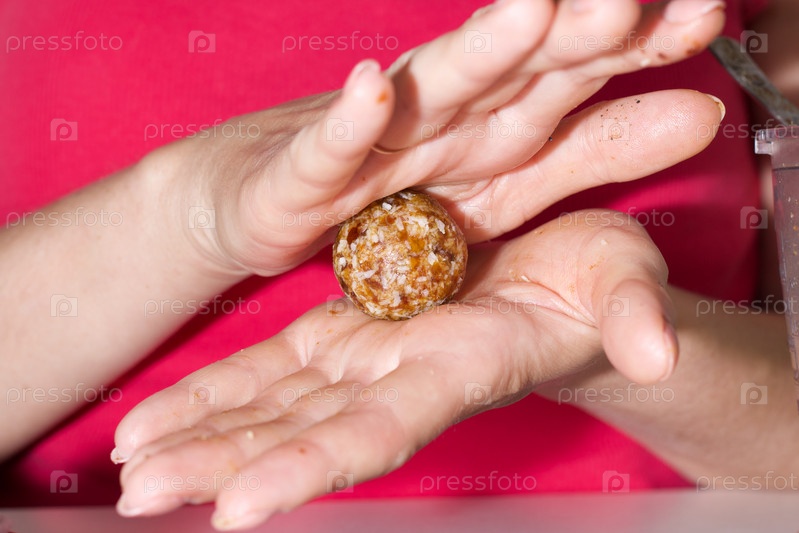 Женщина делает конфеты из сухофруктов. Из чернослива, фиников и кокоса. Катает шарик в ладонях