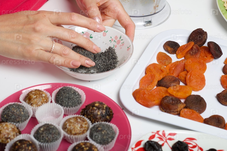 Женщина делает конфеты из сухофруктов. Шарики из чернослива, фиников и кокоса. С посыпкой из черного кунжута