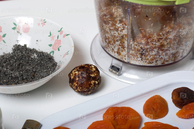 Ингредиенты для сухофруктовых конфет. Из чернослива, фиников и кокоса. С посыпкой из черного кунжута