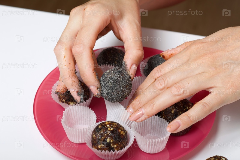 Женщина кладет на тарелку сухофруктовые конфеты. Шарики из чернослива, фиников и кокоса. Посыпанные черным кунжутом