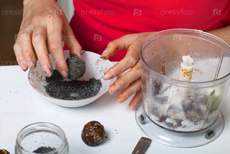 Женщина делает конфеты из сухофруктов. Шарики из чернослива, фиников и кокоса. С посыпкой из черного кунжута