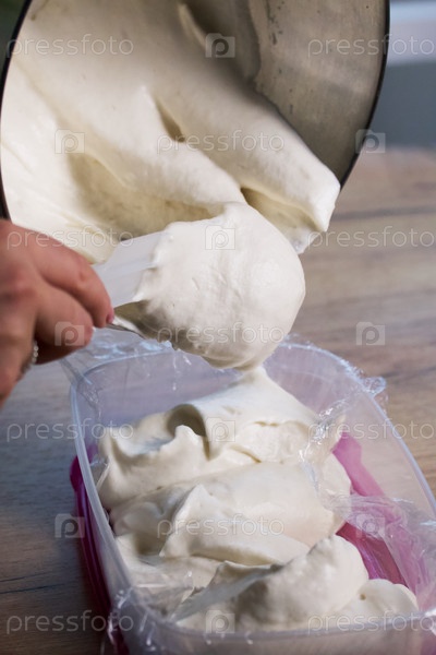 Женщина перекладывает взбитое яблочное пюре с желатином из чаши блендера в контейнер. Крупный план