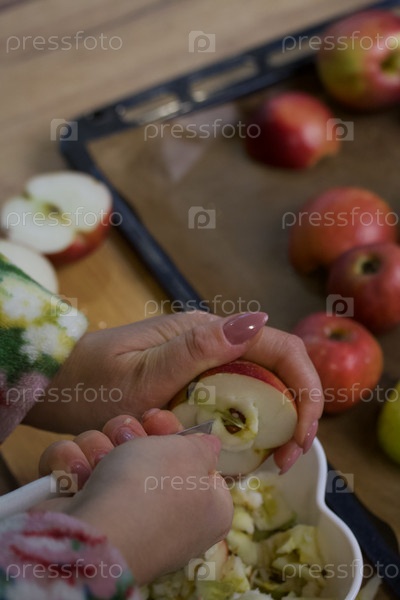 Женщина режет яблоки. Удаляет сердцевину. Из яблочного пюре делает фруктовую пастилу