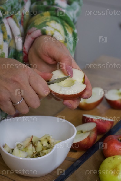 Женщина режет яблоки. Она делает фруктовую пастилу из яблочного пюре. Крупный план