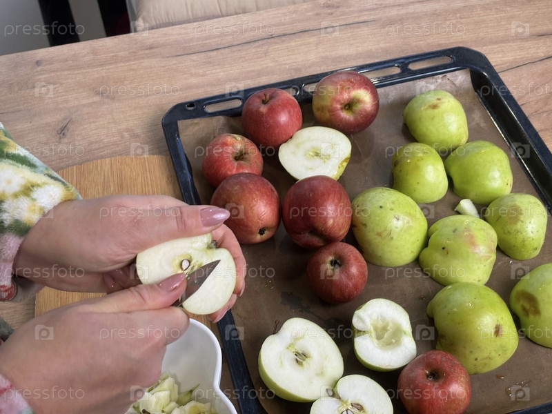Женщина режет яблоки. Она делает из яблочного пюре фруктовую пастилу