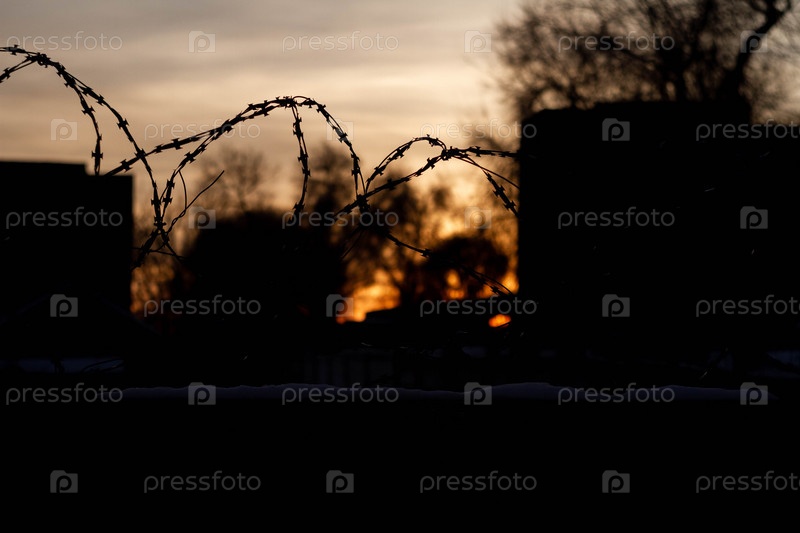 Колючая проволока на тюремном заборе. Закрытая тюрьма. Концепция безопасности. Запретная территория