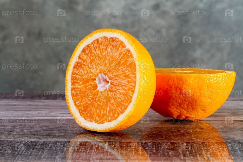 Целый апельсин и разрезанная половина. оранжевый фрукт на фоне текстуры бетона. copyspace