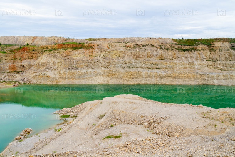 Образование озера в старом заброшенном карьере. Карьерное озеро. Отвалы щебня на закрытой территории для добычи камня. Прекращение горных работ