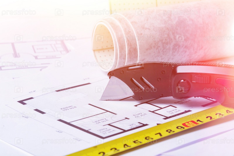 План здания. Инструменты для укладки линолеума и напольных покрытий. Ремонт в доме