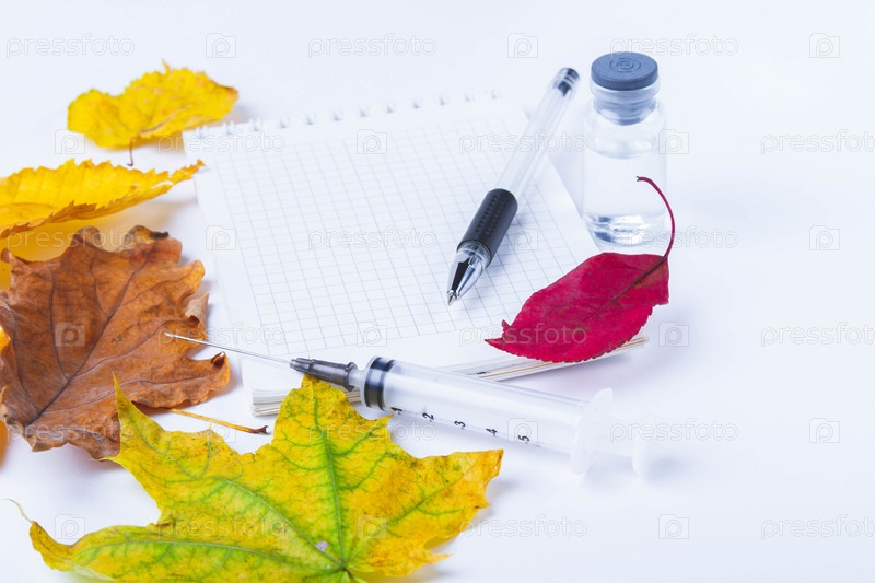 Вакцина и шприц на столе рядом с блокнотом врача и осенними листьями. Чистый блокнот для заметок в кабинете врача. Осенняя вакцинация