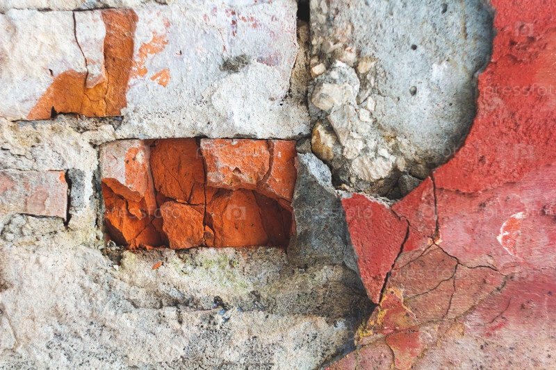 Старая стена с глубокими трещинами. Текстура камня и сломанного бетона. Гранжевая текстура разрушенной стены