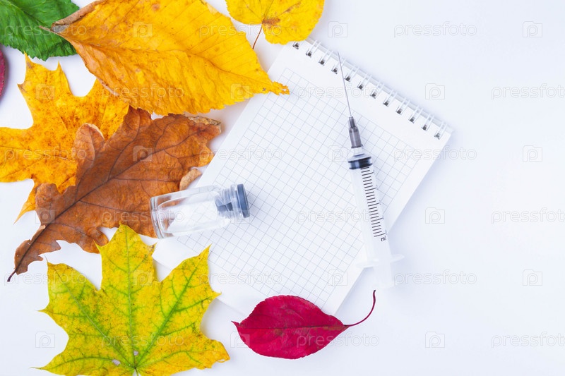 Вакцина и шприц на столе рядом с блокнотом врача и осенними листьями. Чистый блокнот для заметок в кабинете врача. Осенняя вакцинация