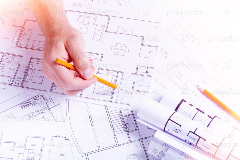 Руки строителя на фоне плана дома. Планирование строительства. Составление сметы