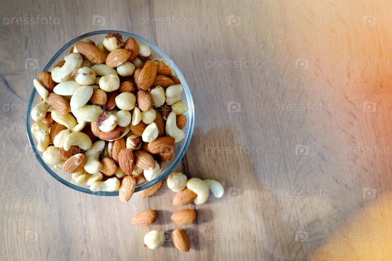 Кешью, арахис и миндаль на тарелке. Орехи на столе в ярких лучах солнца
