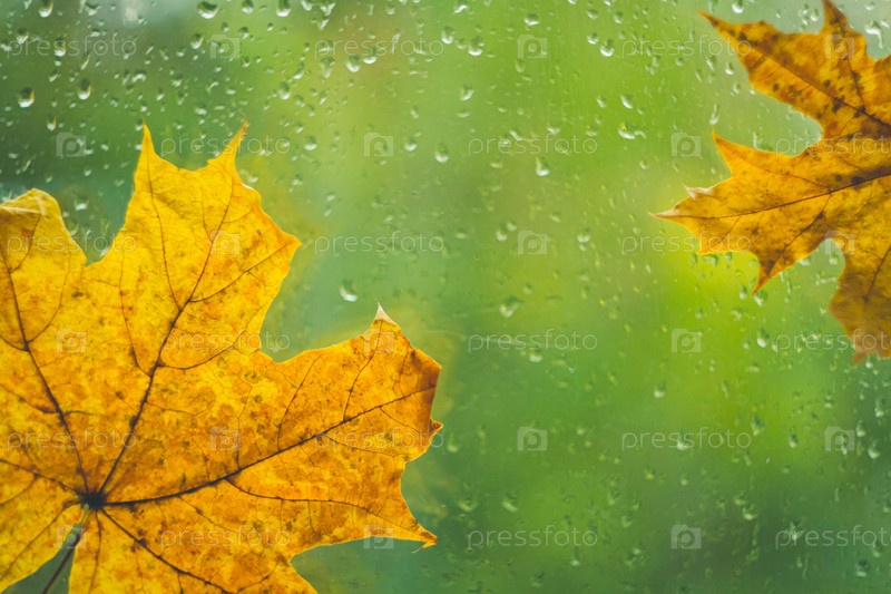 Осенний кленовый лист желтый на стекле с каплями дождя. Осенняя погода. Дождь за окном