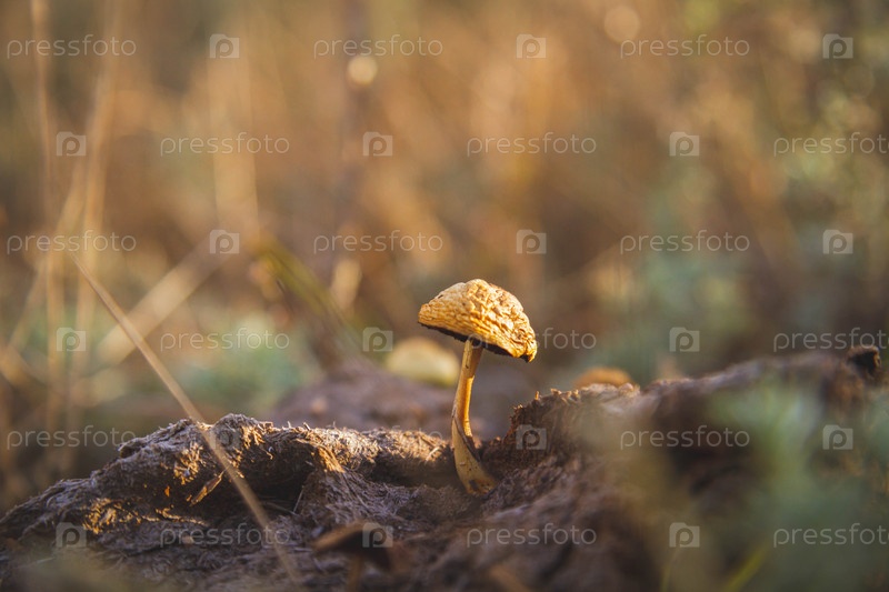 Гриб крупным планом. Маленький гриб растет из кучи навоза. На закате