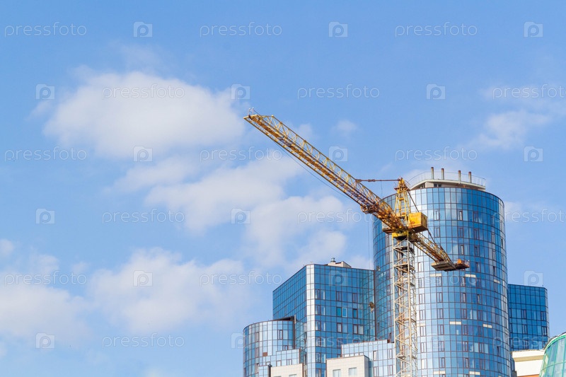 Строительство в мегаполисе. Строительный кран на фоне делового центра в центре города